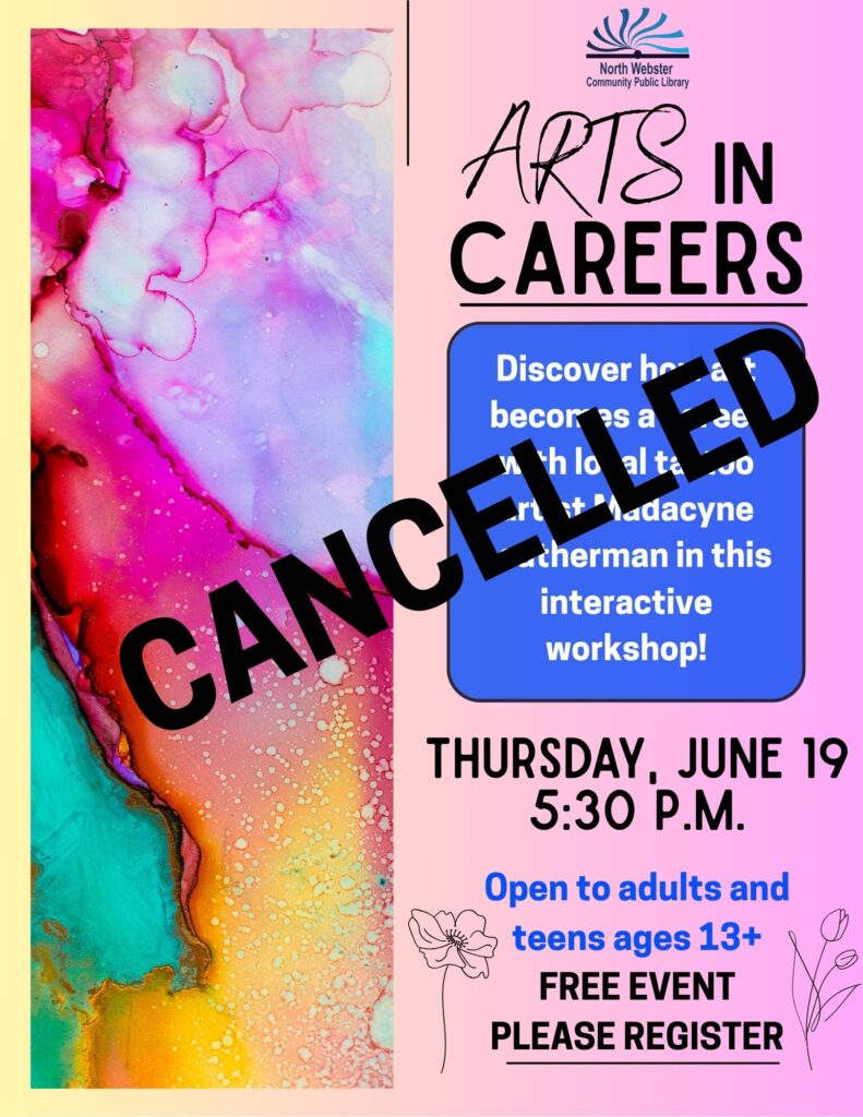 Curious how to turn creativity into a career? Join us for our Arts in Careers series at the library! In this interactive workshop, we’ll welcome Madacyne Leatherman from Cyne Art & Tattoo Studio in downtown North Webster. She’ll share her background in the arts and how she found her path into the world of tattooing. Participants will also get the chance to express themselves through a creative, hands-on art activity — no needles involved! Open to teens and adults ages 13 and up. Registration is required; space is limited.
