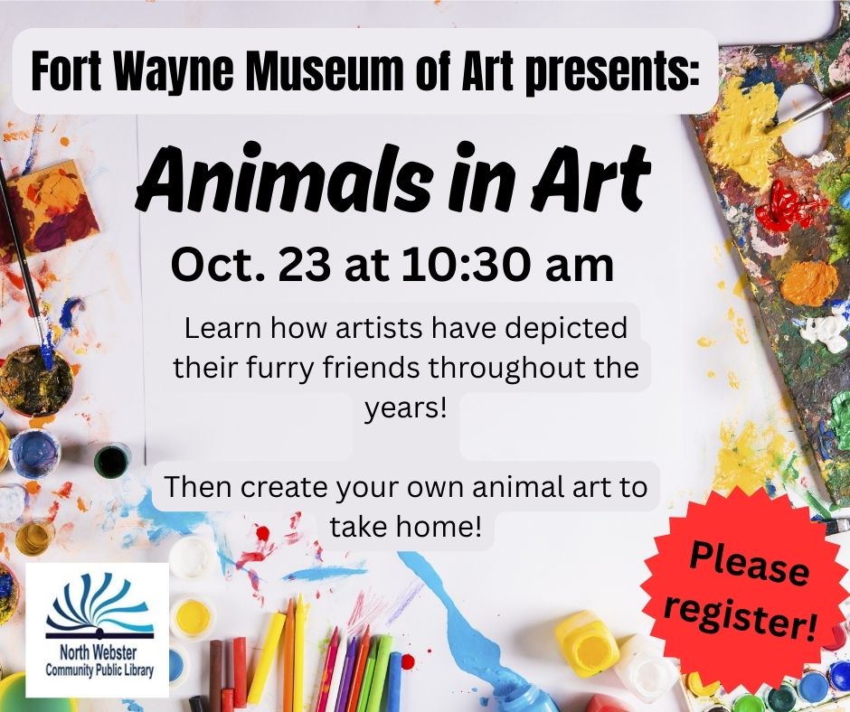 The Fort Wayne Museum of Art is bringing art right to us with their traveling exhibit. This time, it’s all about Animals in Art! Come explore how artists have painted, drawn, and imagined their favorite animal pals through history. Then, you’ll get to create your very own animal masterpiece to take home!