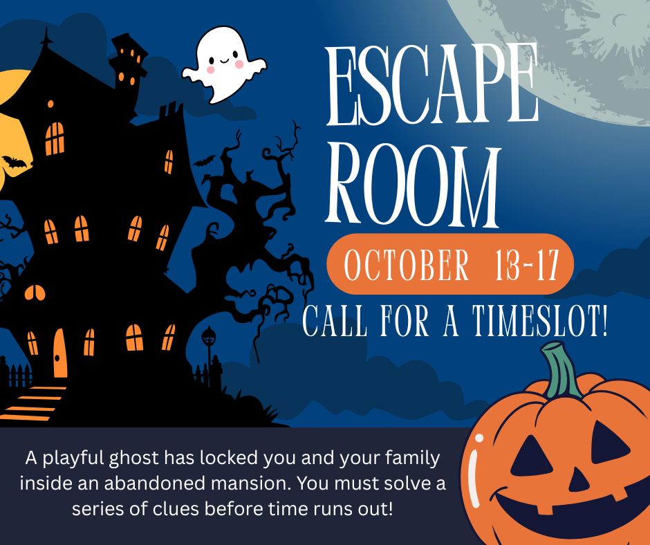 A playful ghost has locked you and your family inside an abandoned mansion. You must solve a series of clues before time runs out and you are trapped inside forever! By appointment only. To schedule, call 574-834-7122.