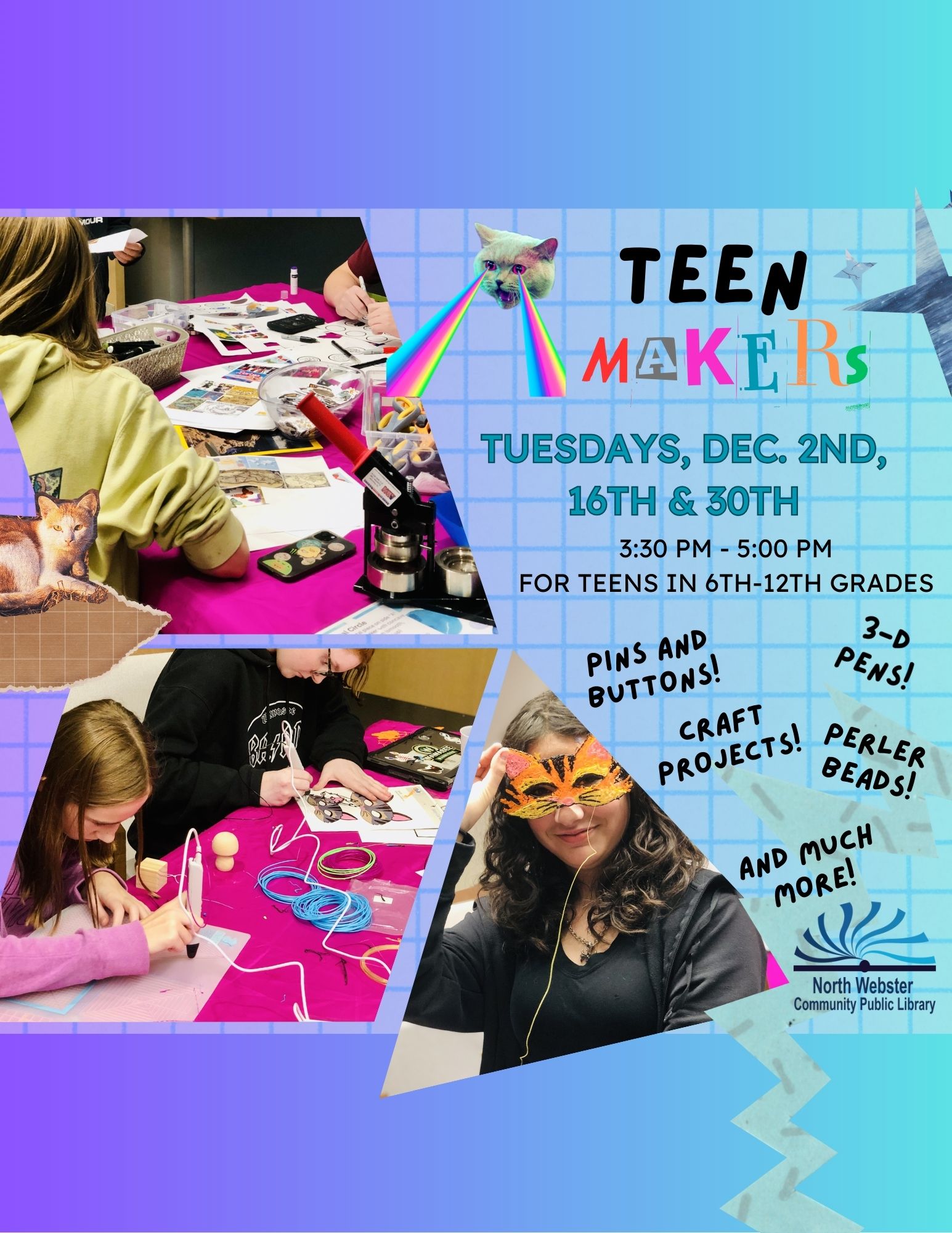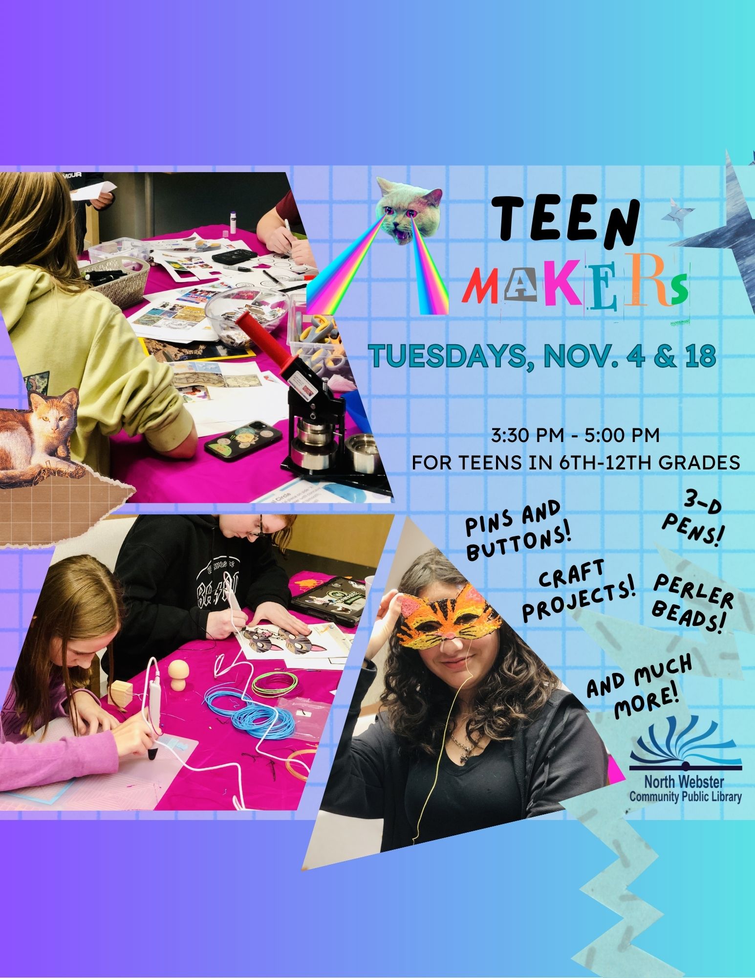 Join us every other Tuesday to flex your creative skills. Think 3D pens, button making, perler beads, jewelry making and more. If you like to craft or tinker, this program is for you! Open to all students in grades 6-12.