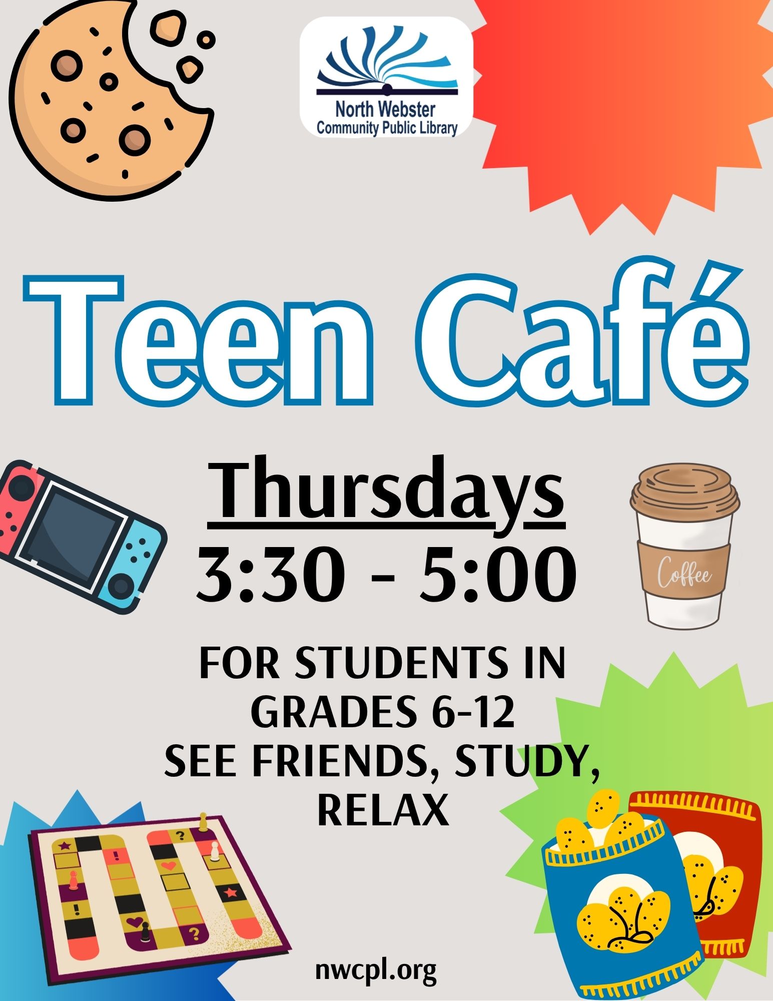 NWCPL 110 East North Street, North Webster, IN, United StatesStop by the Library every Monday from 3:30-5:00 p.m. to see friends, relax, enjoy snacks, make a craft, study, play board games or color. Open to grades 6-12.